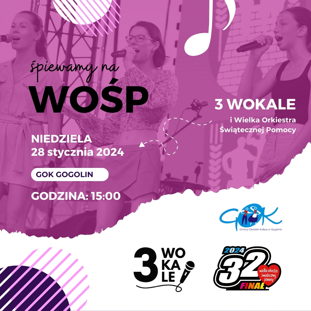 32 Finał WOŚP / Gogolin Data 28 lutego 2024 Zakończone Czas 18:00 Lokalizacja GOK Gogolin Plac Dworcowy 5, 47-320 Gogolin Strona WWW https://www.gok-gogolin.pl/ Telefon +48 77 554 50 21 Kategoria Występy